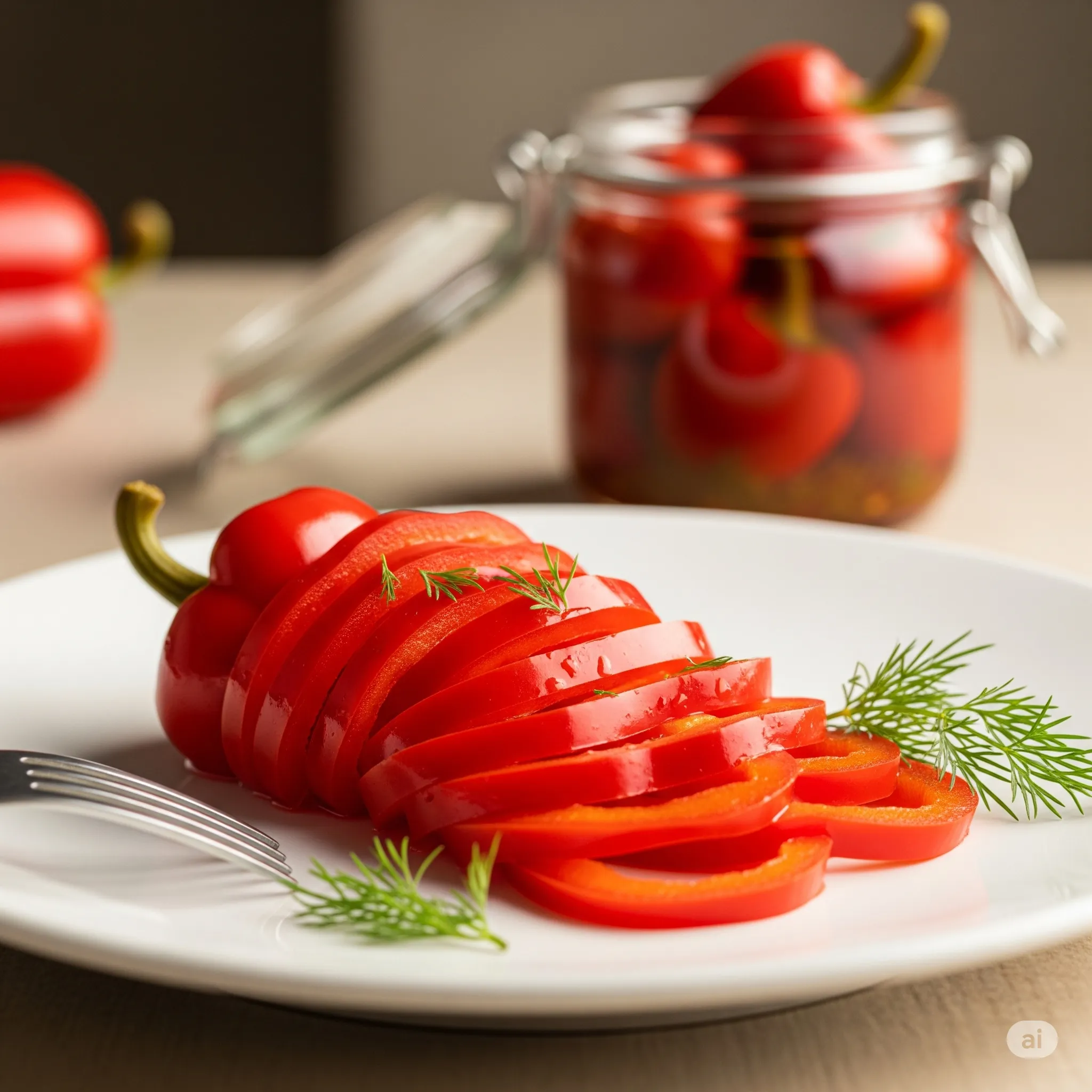 A beautifully styled shot of pickled red bell peppers, thinly sliced, fanned out on a white ceramic plate with a few sprigs of fresh dill. A small, elegant glass Pickles jar of whole pickled peppers in the background, slightly out of focus. Soft, warm lighting, gourmet presentation