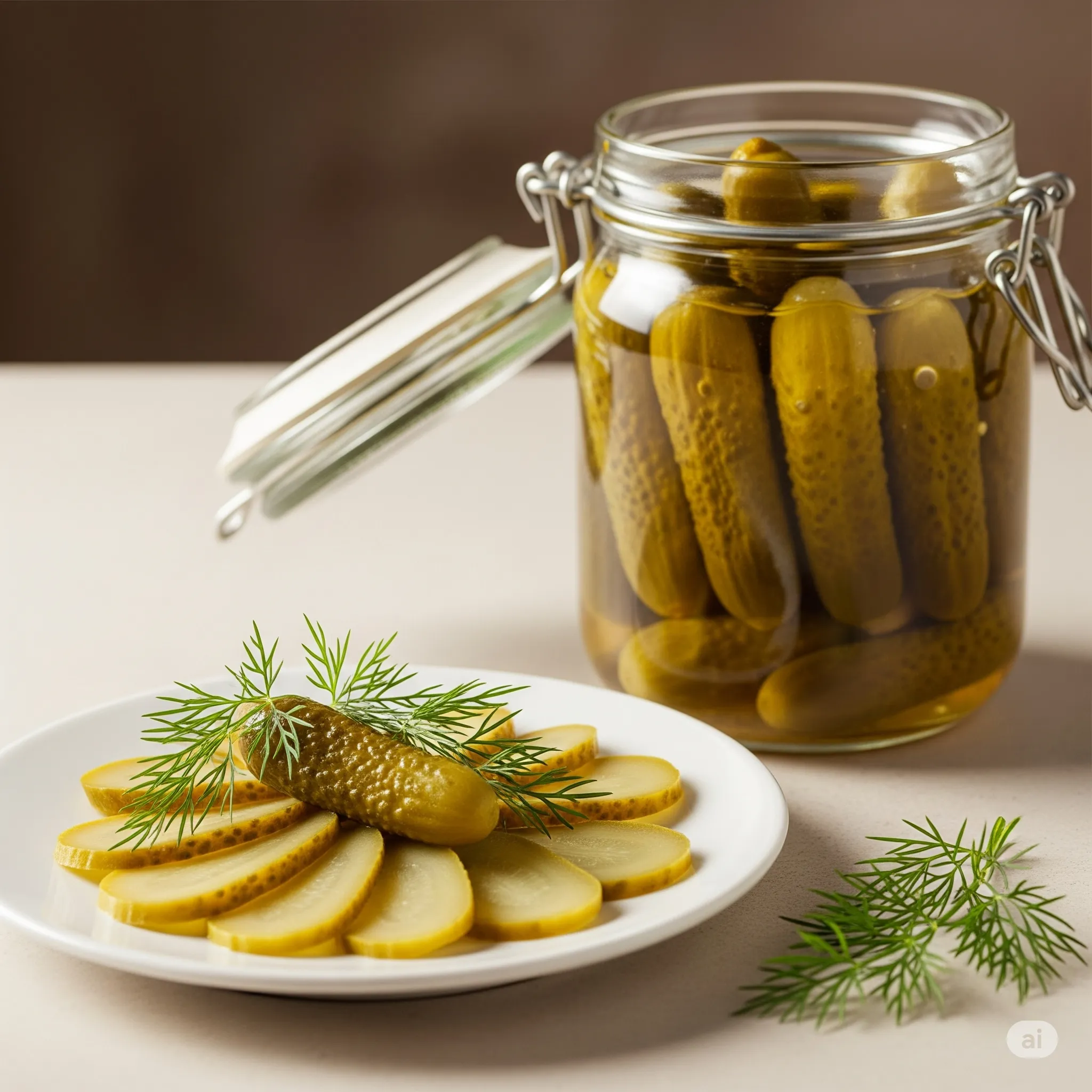 A professionally styled photograph of a glass jar filled with pickled cornichons, placed next to a small white ceramic plate. On the plate, thinly sliced cornichons are fanned out in an elegant arrangement, garnished with fresh dill sprigs. The scene is lit with soft, warm light, highlighting the textures and colors of the cornichons and dill. The background is slightly blurred.